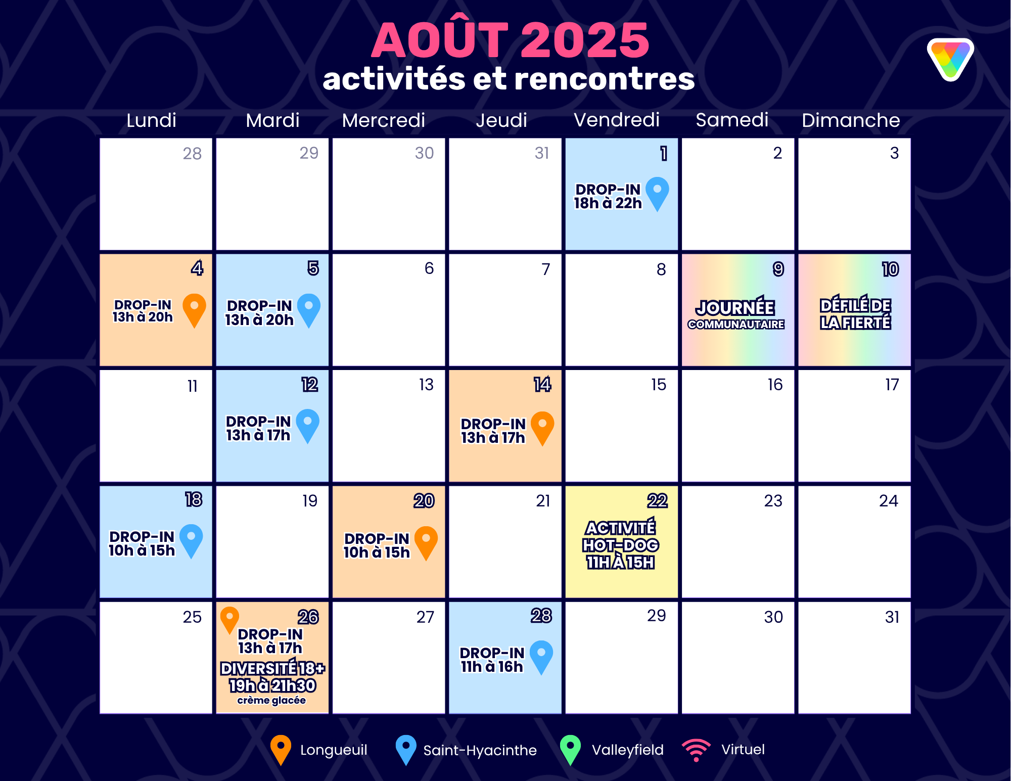 Le JAG tiendra des journées « Drop-in », c’est-à-dire des moments où les membres de la communauté LGBTQ+ peuvent se présenter sans rendez-vous au point de service indiqué sur le calendrier. Ces drop-in sont à votre disposition dans le but de socialiser, discuter, faire vos devoirs ou même lire et bricoler. Nous vous attendons avec impatience.